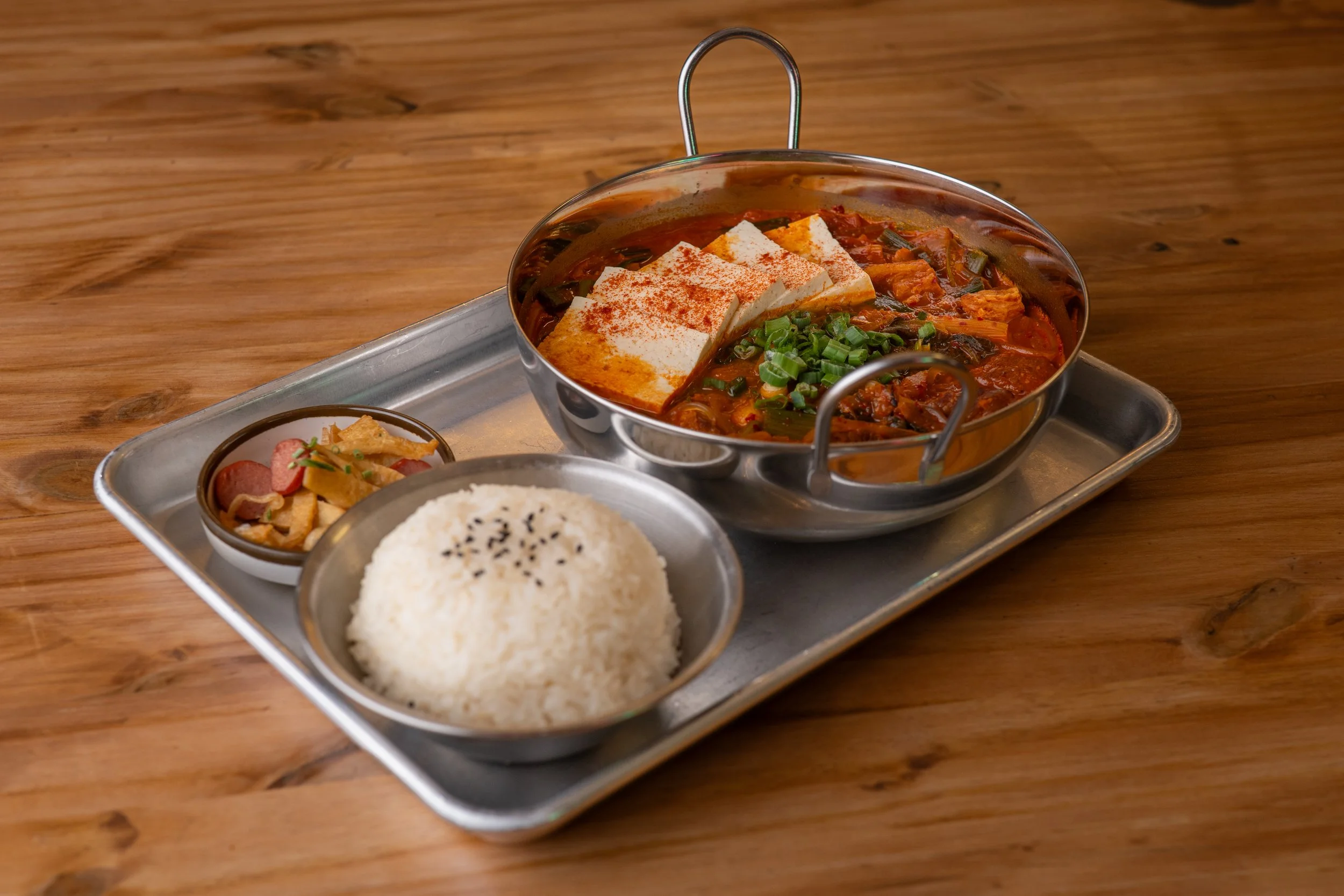 Kimchi Ham Stew made with a variety ingredients include spam, sausage, ham, corn, kimchi, instant noodles, and American cheese. Served with 3 side dishes and 2 bowls of rice.